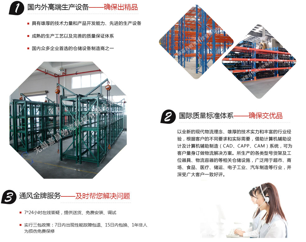 無錫嘉昌倉儲(chǔ)貨架有限公司擁有多年的設(shè)計(jì)、生產(chǎn)、管理經(jīng)驗(yàn)。以全新的現(xiàn)代物流理念、雄厚的技術(shù)實(shí)力和豐富的行業(yè)經(jīng)驗(yàn),根據(jù)客戶的不同要求和實(shí)際需要,借助計(jì)算機(jī)輔助設(shè)計(jì)及計(jì)算機(jī)輔助制造(CAD、CAPP、CAM)系統(tǒng),可為客戶量身訂做物流解決方案。所生產(chǎn)的各類型號(hào)貨架及工位器具、物流容器的等相關(guān)倉儲(chǔ)設(shè)施,廣泛用于超市、商場(chǎng)、食品、醫(yī)療、儲(chǔ)運(yùn)、電子工業(yè)、汽車制造等行業(yè),并深受廣大客戶一致好評(píng)。